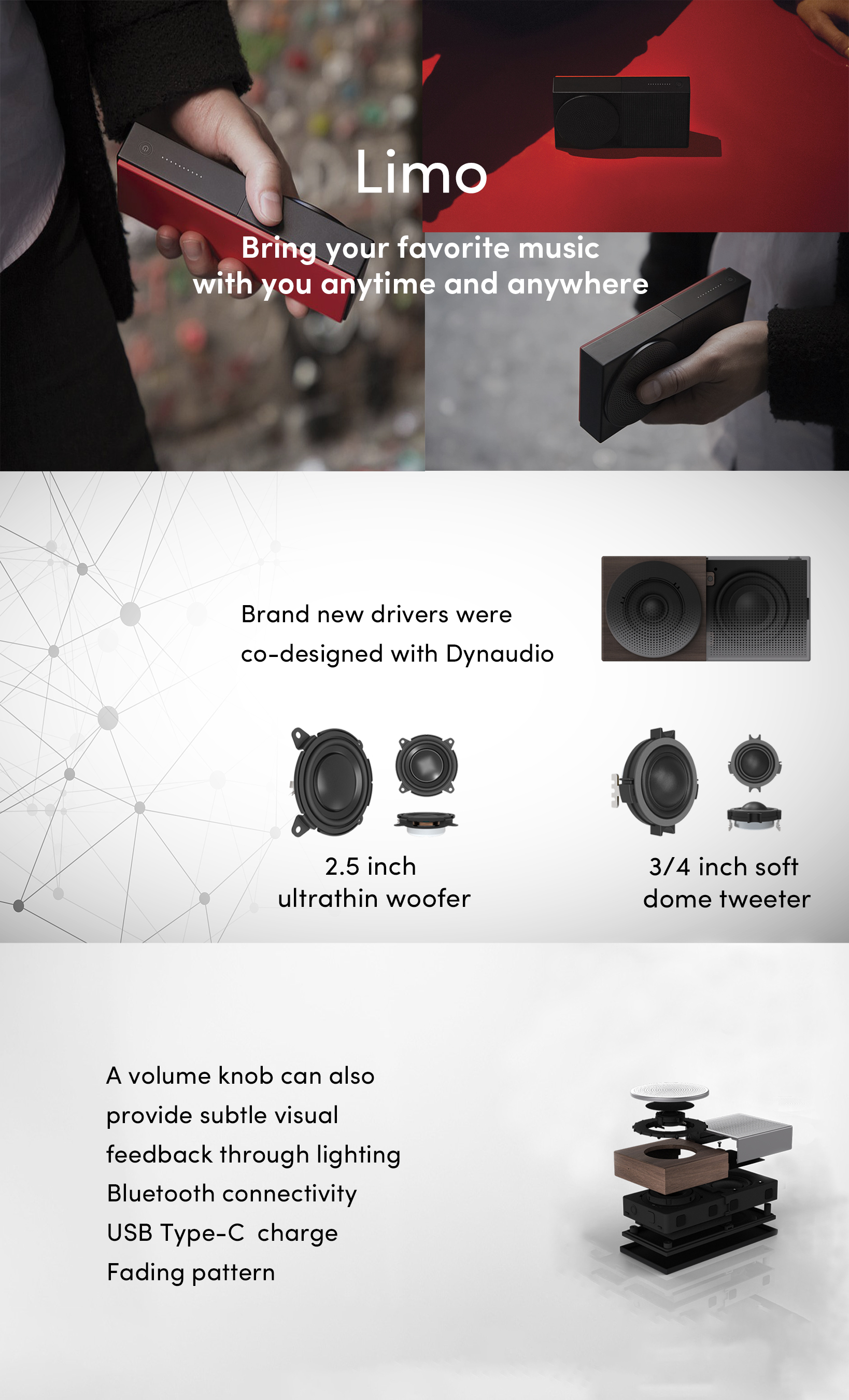 By marrying construction, form, and functionality, Limo is a wireless, portable speaker created for a mobile lifestyle. It was designed with young customers in mind. Its drivers which co-designed with Dynaudio help Limo to reproduce outstanding sound performance and maintain its slim size.