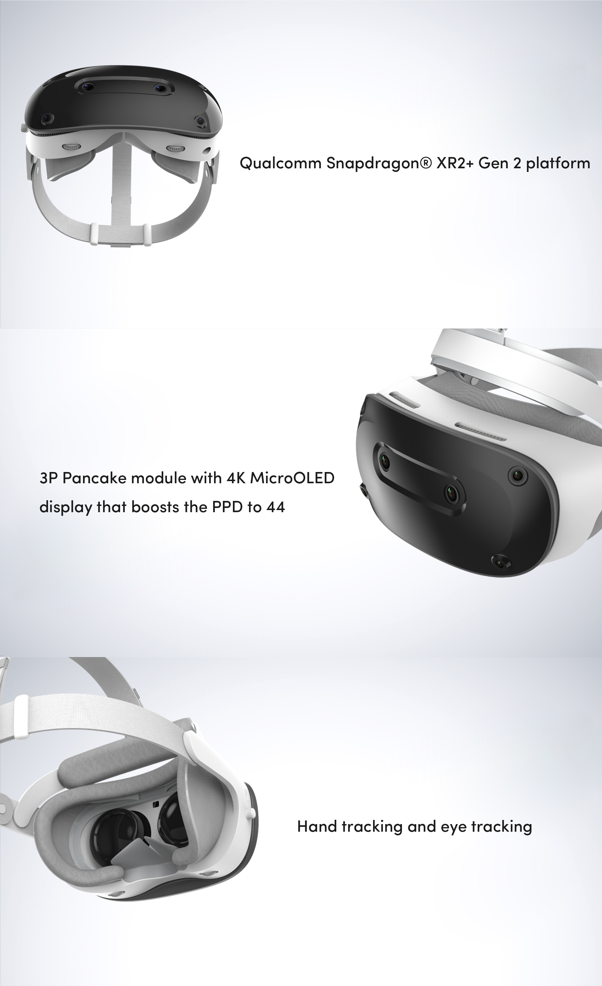 • ■ Powered by the Snapdragon® XR2+ Gen 2 platform, supports a resolution of 4.3K per eye, refresh rate of 90 frames per second, and utilizes 12 parallel camera input for enhanced perception.